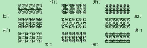 其中八门指的是:休门、生门、伤门、杜门、景门、死门、惊门、开门。